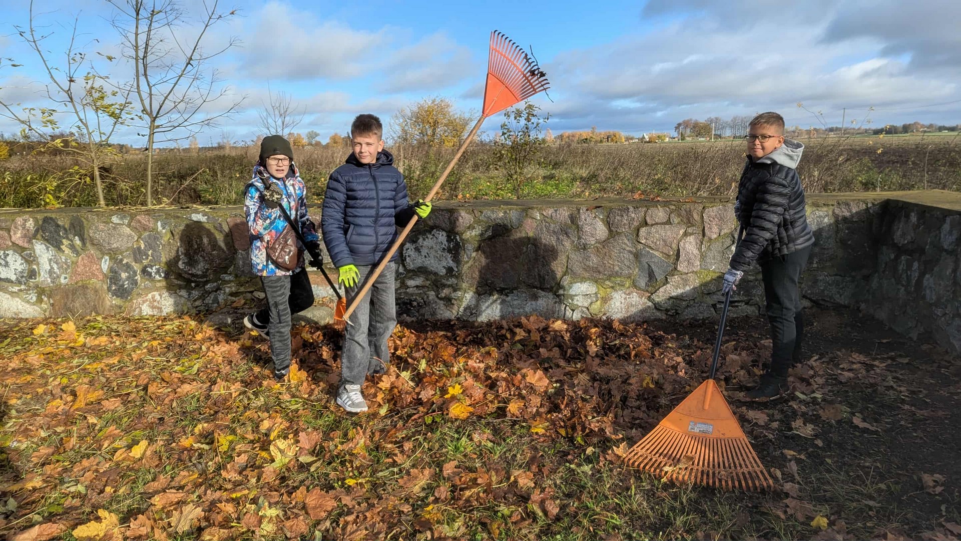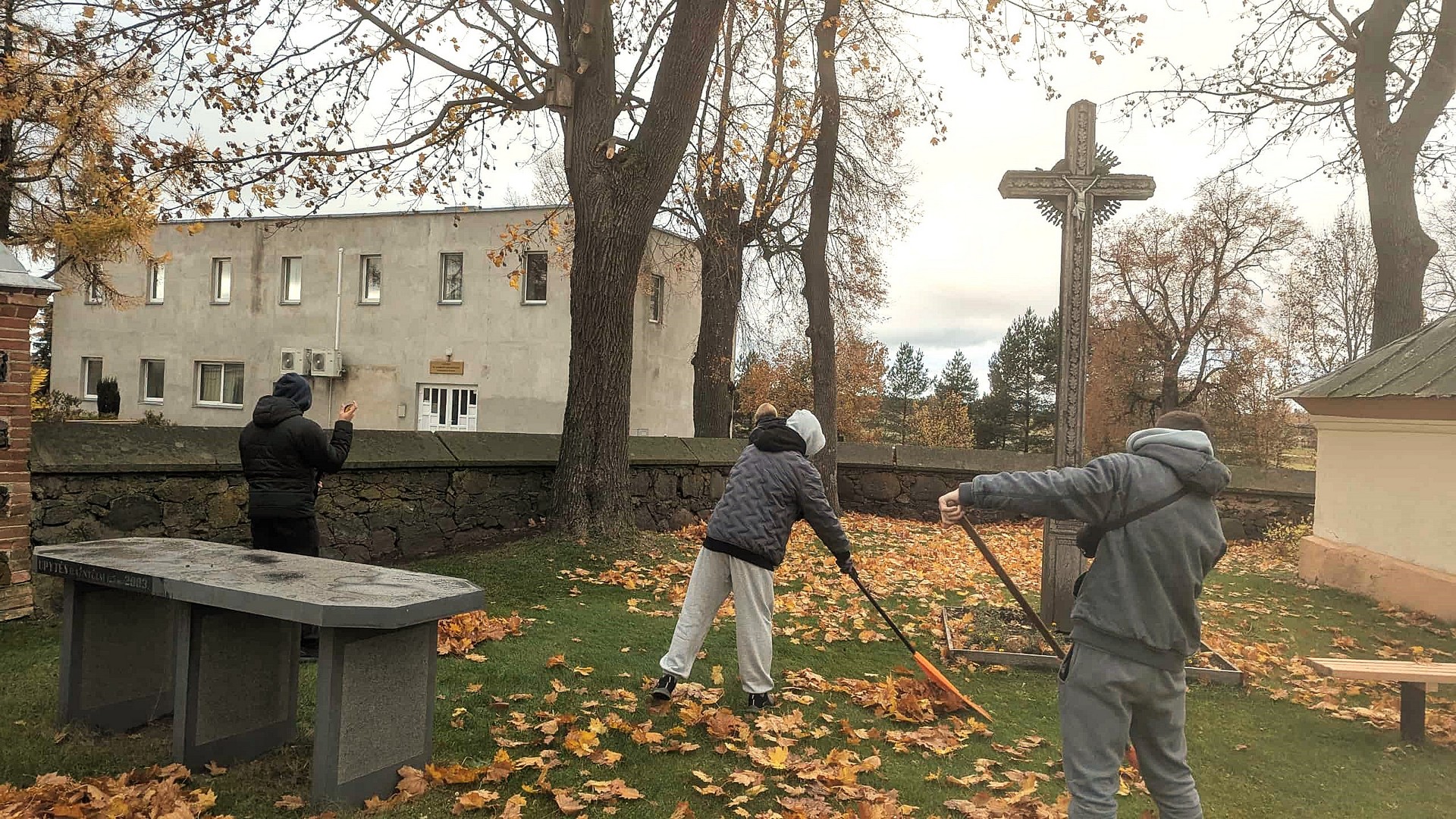 Vaikai talkavo ir Upytės šv. Karolio Boromiejaus bažnyčios šventoriuje. Ši vieta alsuoja ramybe ir pagarba iškeliavusiems į amžinybę. Mokiniai dirbo tyliai, bet darniai ir nuoširdžiai. Vinkšnėnų senosios kapinaitės, aptvertos akmenine tvora, saugo bajorų Eidrigevičių giminės mirusiųjų atminimą. Didingus dvaro laikus menanti vieta retai sulaukia jaunų žmonių žingsnių, tačiau šįsyk ji prisipildė gyvybės – talkininkai valė takelius ir šlavė lapus.