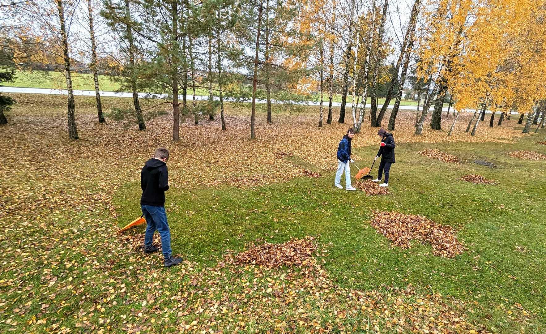 Paskutinė savaitė prieš mokinių atostogas – lapų grėbimo savaitė: kas gali, kas turi laisvo laiko čiumpa įrankius ir į talką. Mokyklos kiemas prisipildė šurmulio: šluotos, grėbliai ir šypsenos. Mokiniai grėbė spalvingus lapus, kaupė juos į dideles krūvas, karučiais vežė į draugiškų mokyklos kaimynų nurodytą vietą.