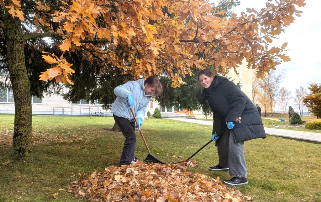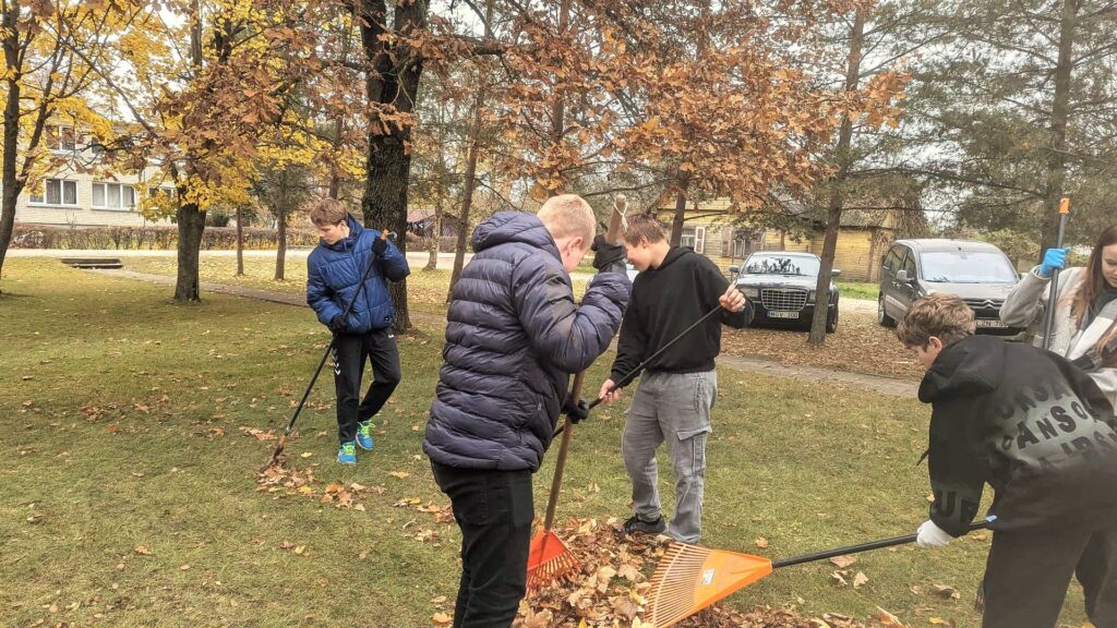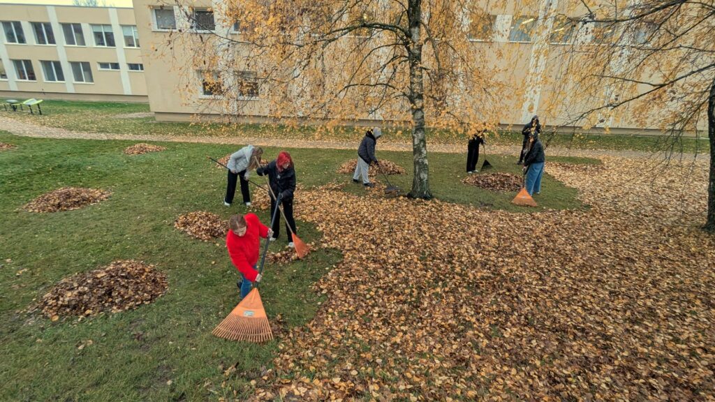 Paskutinė savaitė prieš mokinių atostogas – lapų grėbimo savaitė: kas gali, kas turi laisvo laiko čiumpa įrankius ir į talką. Mokyklos kiemas prisipildė šurmulio: šluotos, grėbliai ir šypsenos. Mokiniai grėbė spalvingus lapus, kaupė juos į dideles krūvas, karučiais vežė į draugiškų mokyklos kaimynų nurodytą vietą.