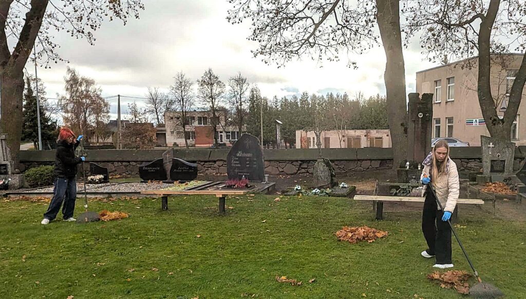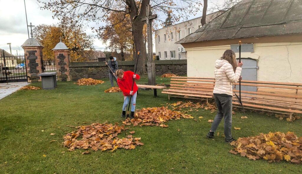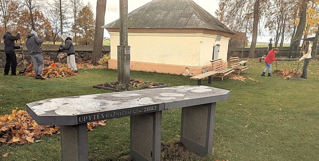 Vaikai talkavo ir Upytės šv. Karolio Boromiejaus bažnyčios šventoriuje. Ši vieta alsuoja ramybe ir pagarba iškeliavusiems į amžinybę. Mokiniai dirbo tyliai, bet darniai ir nuoširdžiai. Vinkšnėnų senosios kapinaitės, aptvertos akmenine tvora, saugo bajorų Eidrigevičių giminės mirusiųjų atminimą. Didingus dvaro laikus menanti vieta retai sulaukia jaunų žmonių žingsnių, tačiau šįsyk ji prisipildė gyvybės – talkininkai valė takelius ir šlavė lapus.