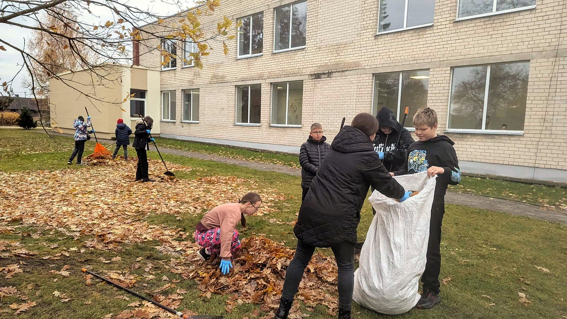 Paskutinė savaitė prieš mokinių atostogas – lapų grėbimo savaitė: kas gali, kas turi laisvo laiko čiumpa įrankius ir į talką. Mokyklos kiemas prisipildė šurmulio: šluotos, grėbliai ir šypsenos. Mokiniai grėbė spalvingus lapus, kaupė juos į dideles krūvas, karučiais vežė į draugiškų mokyklos kaimynų nurodytą vietą.